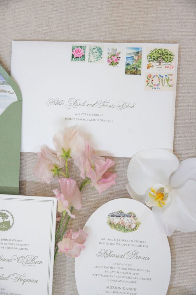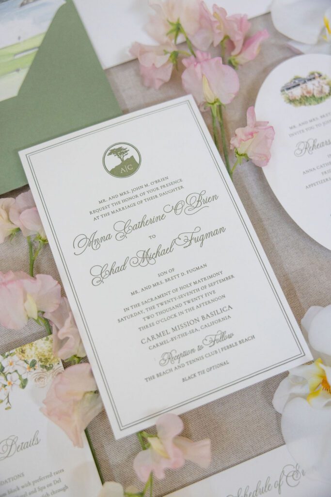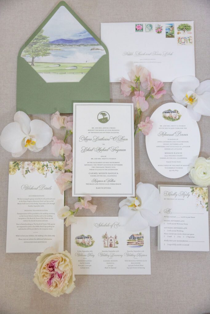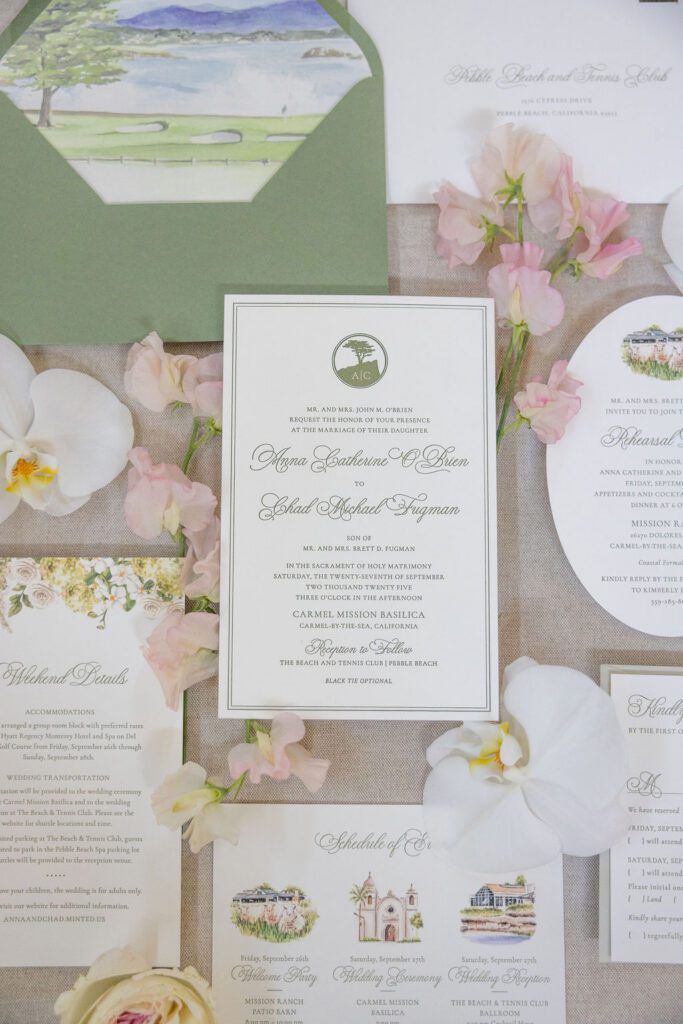 Anna was luminous in her Galia Lahav gown — intricate floral lace, long sleeves, unforgettable — and Chad’s reaction at their first look said more than words ever could. The stationery suite we designed for their day carried those same threads throughout: watercolor illustrations of the Mission and Pebble Beach, a sage green palette, and calligraphy that felt as timeless as the place they both call home.
