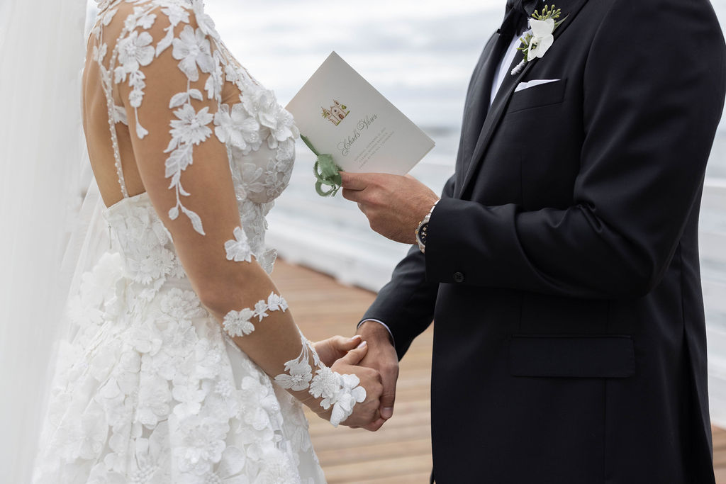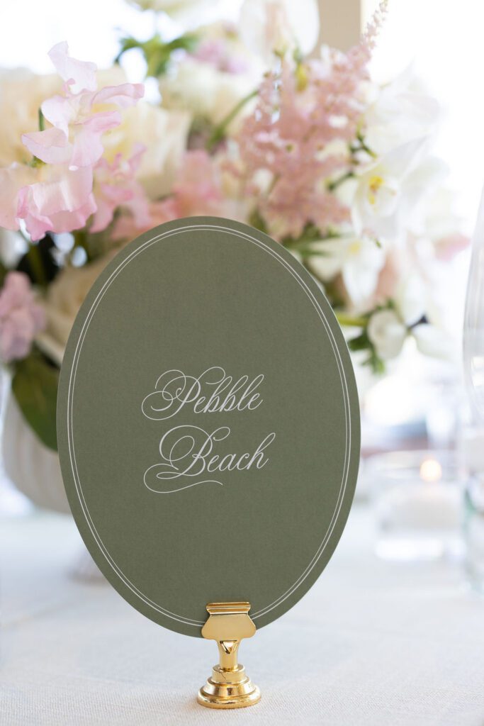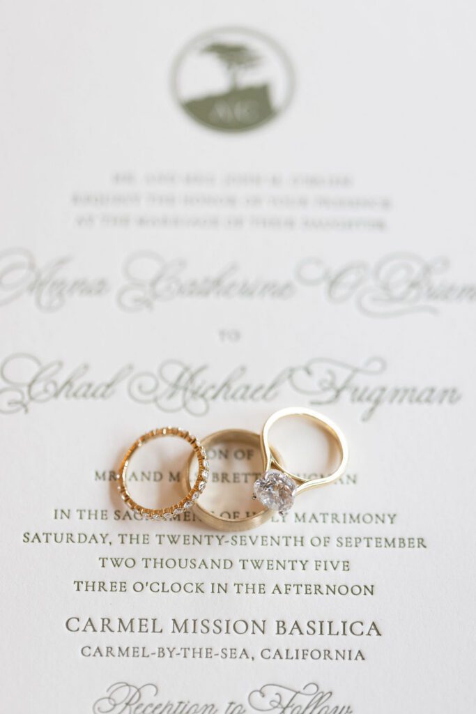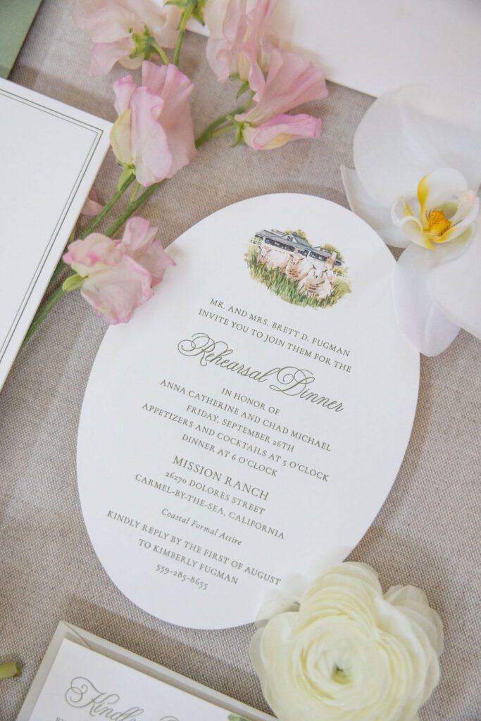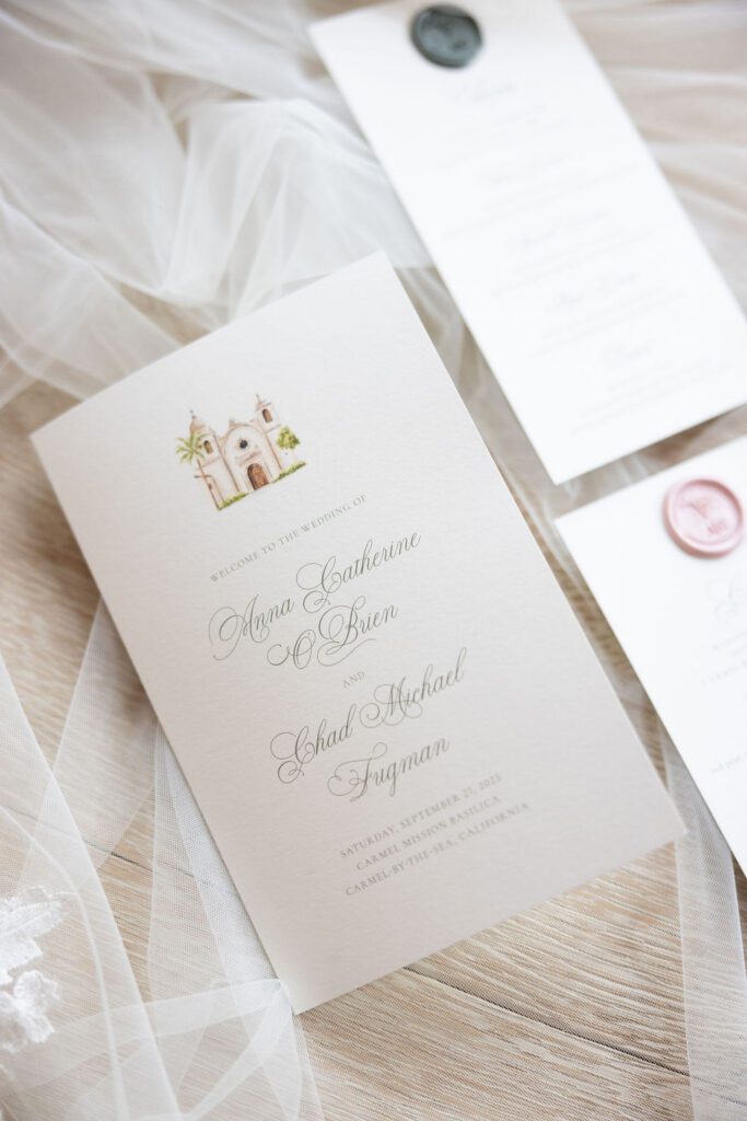Anna was luminous in her Galia Lahav gown — intricate floral lace, long sleeves, unforgettable — and Chad’s reaction at their first look said more than words ever could. The stationery suite we designed for their day carried those same threads throughout: watercolor illustrations of the Mission and Pebble Beach, a sage green palette, and calligraphy that felt as timeless as the place they both call home.