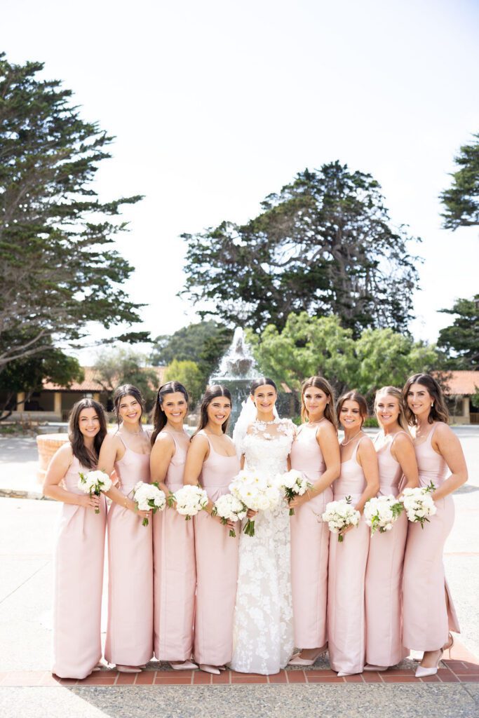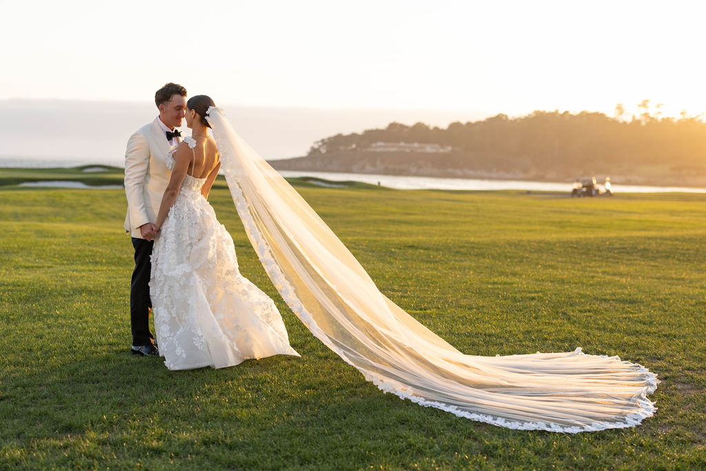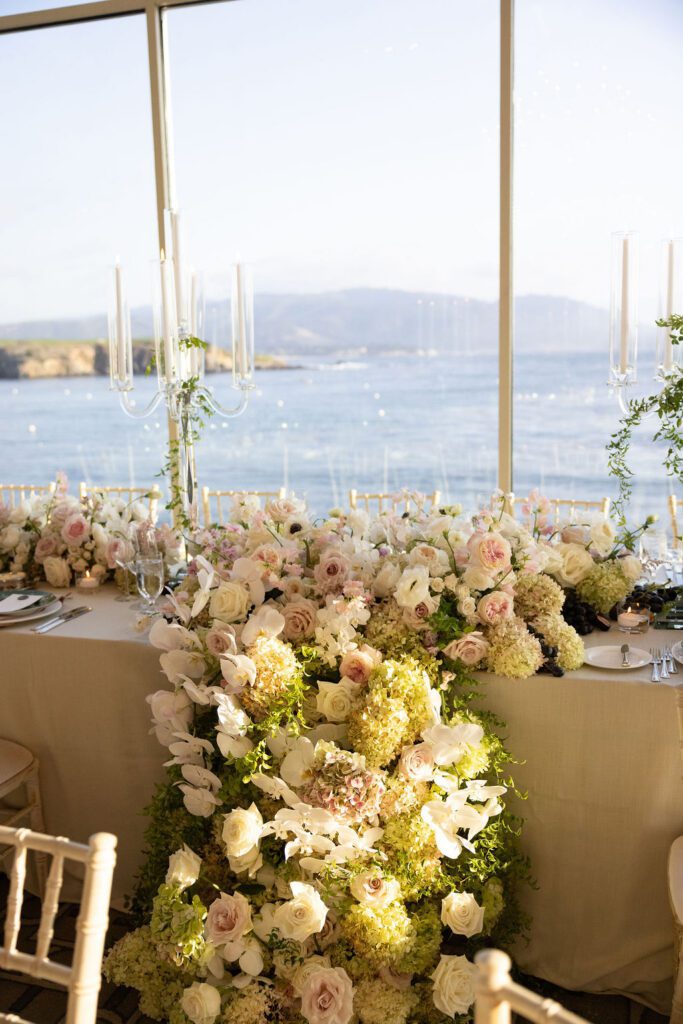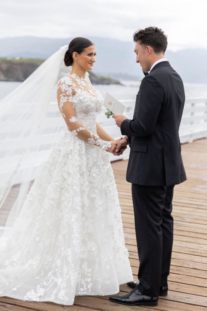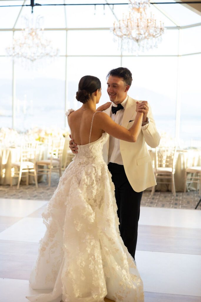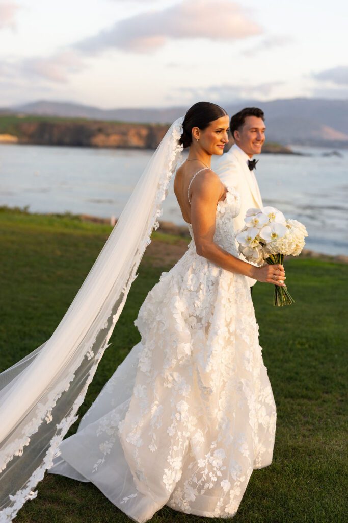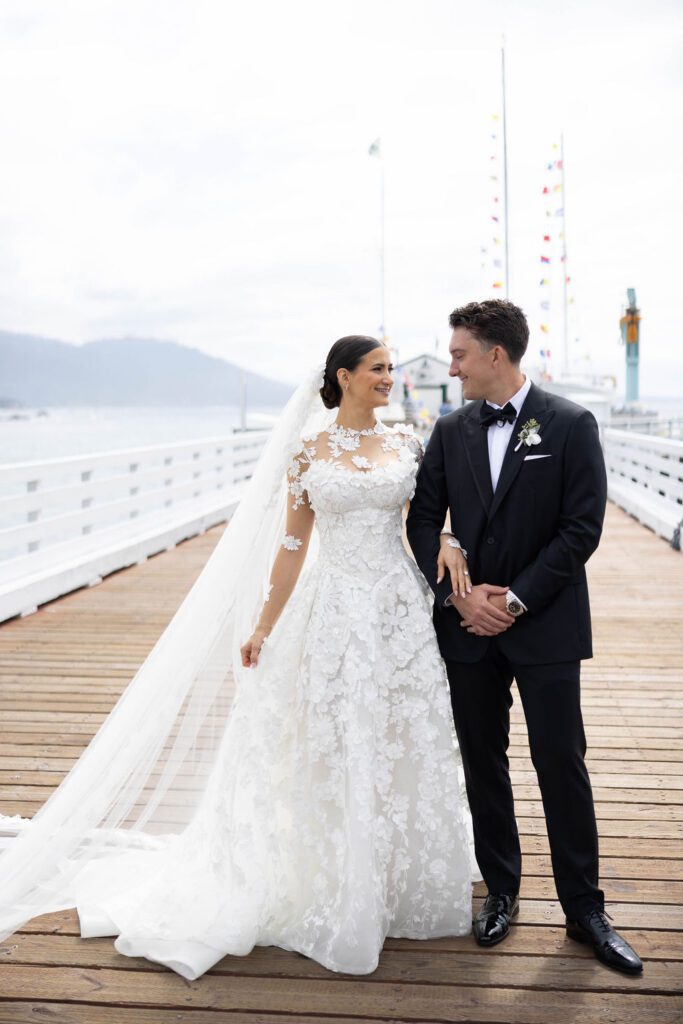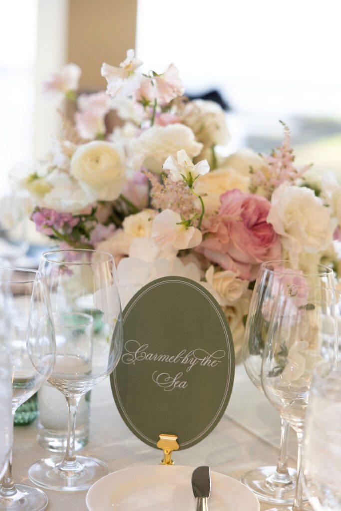 Their wedding day felt like the natural culmination of all of it. Vows exchanged inside the soaring, sacred walls of the Carmel Mission Basilica, followed by an evening at the Beach and Tennis Club, where the Pacific stretched endlessly beyond floor-to-ceiling windows and the golden light of a September coast did what only it can do.